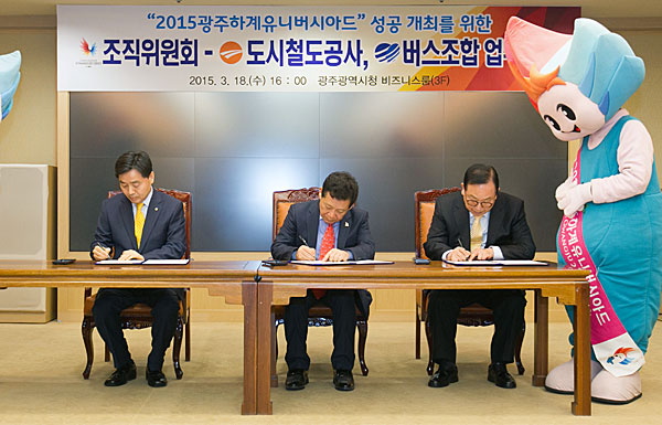 GWANGJU – On March 18, the Gwangju 2015 Universiade Organizing Committee (GUOC) signed a partnership agreement with Gwangju Metropolitan Transit Corporation (Gwangju Metro) and the Gwangju Bus Union. As a result of this new partnership, Gwangju will provide free public transportation to the Universiade Family, which includes athletes, officials, FISU Family etc. The Universiade Family can use free public transportation within the city during the Universiade Games.