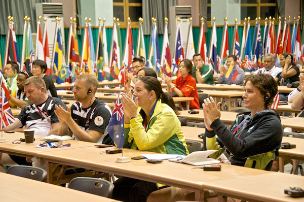 FISU President Gallien was invited to attend the first Heads of Delegation Daily Meeting in the Athletes’ Village.