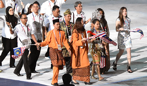 101 Malaysian athletes proudly paraded during the 28th SU Opening Ceremony, not in typical sports uniforms but in different traditional national costumes. For example, their Chinese girls were wearing a ‘chongsam’, which is worn by young Chinese women in daily life. Some others wore a ‘sari’. Some girls were dressed in a ‘kadazan’, which normally is worn at wedding ceremonies. The Malaysian male athletes were wearing a ‘silat’ costume, which was the outfit used to wear to go to war.