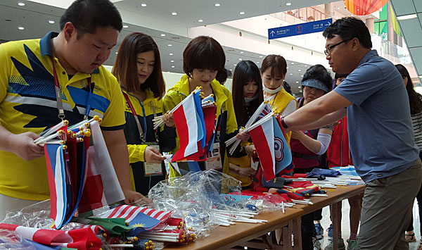 GWANGJU – Flags are an essential part of the 2015 Gwangju Summer Universiade. The flags of Korea and FISU were hoisted during the Opening Ceremony and flags of all participating nations were carried into the stadium by designated flag bearers at the march pass. Flags also decorate the little pins athletes and other delegation members exchange from nation to nation. And flags are used by fans during competitions and athletes after competitions to show their national pride.