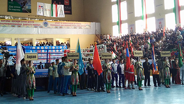 The marching pass started with the entrance of the Referee team. When the 8 teams from Afghanistan, Iran, Japan, Kazakhstan, Kyrgyzstan, Mongolia, Turkmenistan and host country Tajikistan marched in the stadium, all the audiences cheered and gave them the warmest welcome. This championship was the first international event in Tajikistan, so it was very attractive not only for the media, but also for the audiences, most of whom were students.