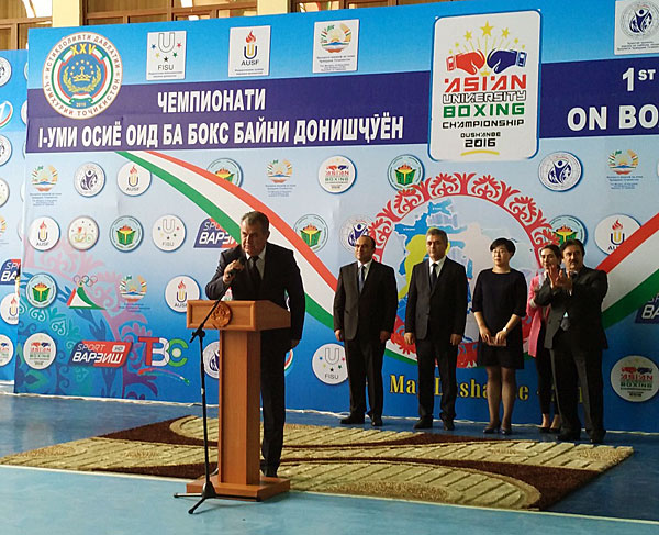 DUSHANBE – The 1st Asian University Boxing Championship in Dushanbe, Tajikistan was in full swing from 3 to 8 May, 2016. Teams from eight countries, including Afghanistan, Iran, Japan, Kazakhstan, Kyrgyzstan, Mongolia, Thailand and Tajikistan were going to participate in this Championship, which was the first AUSF event in Tajikistan, and as well the first international event in Tajikistan. On the occasion of the 25th Anniversary Celebration for the Independence of the Republic of Tajikistan, this championship received the best wishes from the Asian delegations.