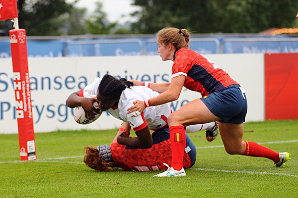 Defending women’s champions Canada squeaked through their opening game 14-12 with Portugal missing a last-gasp conversion that would have secured a draw before turning on the style to beat Spain 17-5.