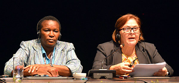 Penninah Kabenge (left) with Rosaura Mendez presenting the report of the Gender Equality Committee