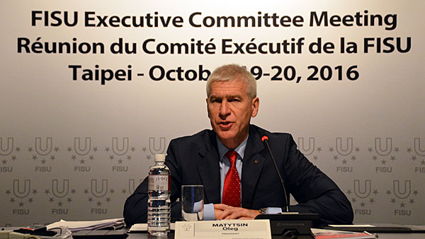 TAIPEI CITY – Today, 19 October, the FISU Executive Committee met in Taipei City, host city of the 29th Summer Universiade in 2017. The session began with the report of the President of FISU Oleg Matytsin. In his report, the FISU President presented the outlook for the university sports movement and welcomed the attribution of the 2019 Summer Universiade to Naples (ITA). He also noted that FISU had found some financial stability with the arrival of new partners.
