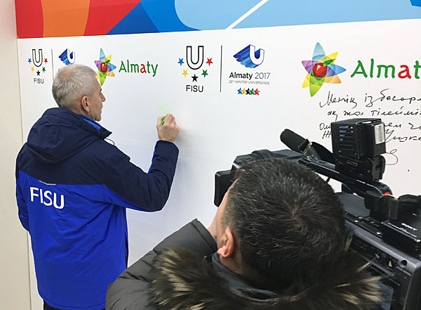 Speaking to the media after the tour, the FISU President positively assessed the Athletes’ Village. He also left an encouraging note for Universiade participants and citizens of Almaty at a special board.