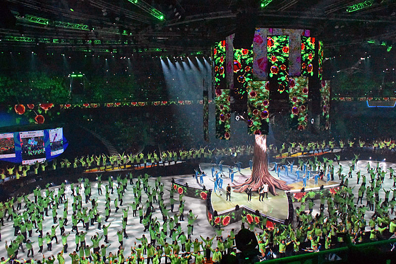 After a wonderful music and dance spectacle and the national anthem of the host country, all flags of the participating delegations were marched in the Arena, followed by all delegations.