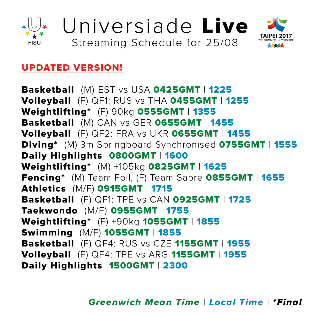 The updated FISU TV live streaming schedule for Friday, August 25th