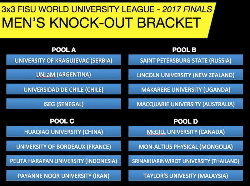 16 men’s and 16 women’s university teams will be looking to stake their claim as victors to the 3×3 FISU World University League – 2017 Finals