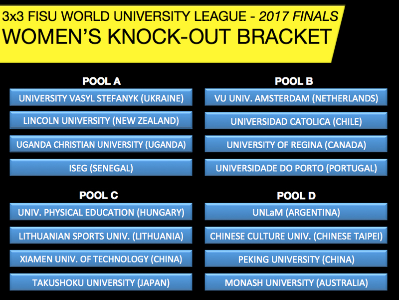 LAUSANNE, SWITZERLAND – The 3×3 FISU World University League – 2017 Finals’ competition draw is now complete. The 16 men’s and 16 women’s university teams are set out in four groups of four teams and will play out over the four competition days from 14 to 17 September in Xiamen, China. Teams were seeded according to FIBA 3×3 ranking points and the stages are set. In the men’s tournament, the EUSA champions University of Kragujevac (SRB) are the number one seed. In the women’s bracket, Vasyl Stefanyk Precarpathian National University (UKR) is the top-seeded university.