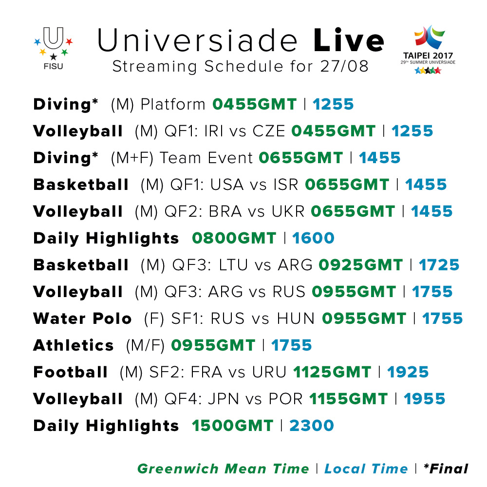 As the international university sports leader, FISU continues it’s live streaming programme for Day 5 of the Taipei Summer Universiade. You can stream all the programmes for free — either on FISU Facebook or through FISU TV. Here’s the schedule for Sunday, August 27th: