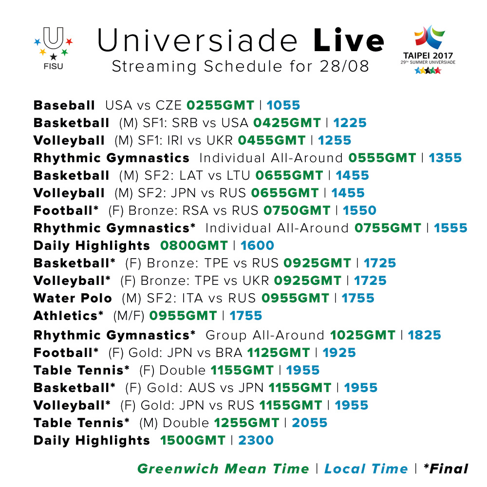 As the international university sports leader, FISU continues it’s live streaming programme for Day 5 of the Taipei Summer Universiade. You can stream all the programmes for free — either on FISU Facebook or through FISU TV. Here’s the schedule for Monday, August 28th: