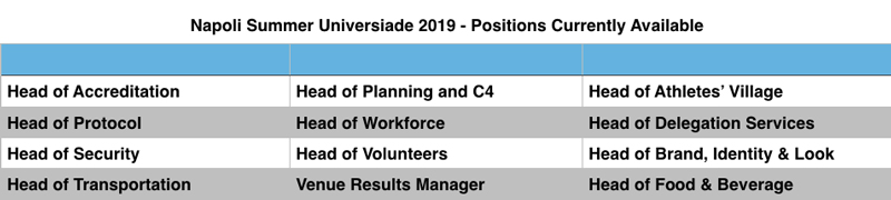 Looking for a senior management position in the world of sport event delivery? If so, you should definitely check out the open positions with Agenzia Regionale Universiadi (ARU), the organising committee bringing the Summer Universiade to Napoli, Italy during July 2019.