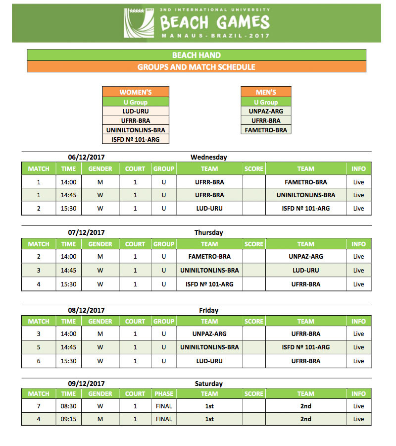 Brazil will be represented by the teams that participated in the Brazilian University Beach Games, and teams from the universities of Amazonas, representing the host state.