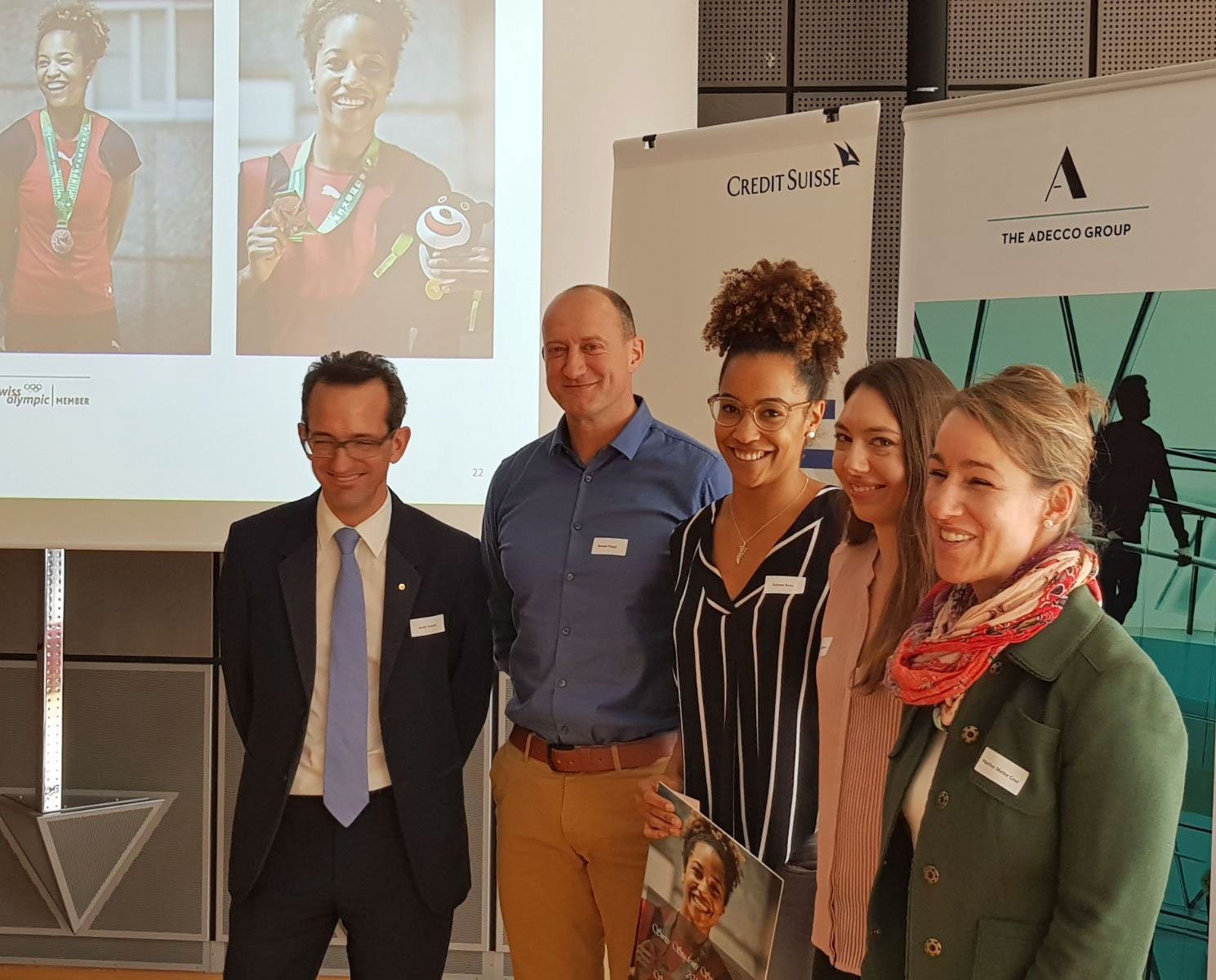 Andreas Csonka, Renato Maggi (HoD Summer Universiade), Salomé Kora (Bronze medal 100m and Gold medal 4x100m at SU 2017), Cornelia Halbheer (Gold medal 4x100m at SU 2017) and Marilen Matter Graf, Head of Elite Sports SUS