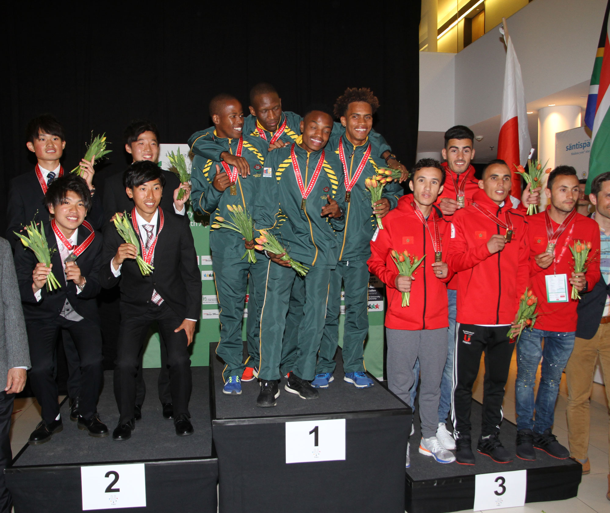 The women’s podium from the 21st edition of the World University Cross-Country Championship saw Japan (centre) take home the gold, with Germany (left) winning sliver and Italy (right) the bronze in the team competition