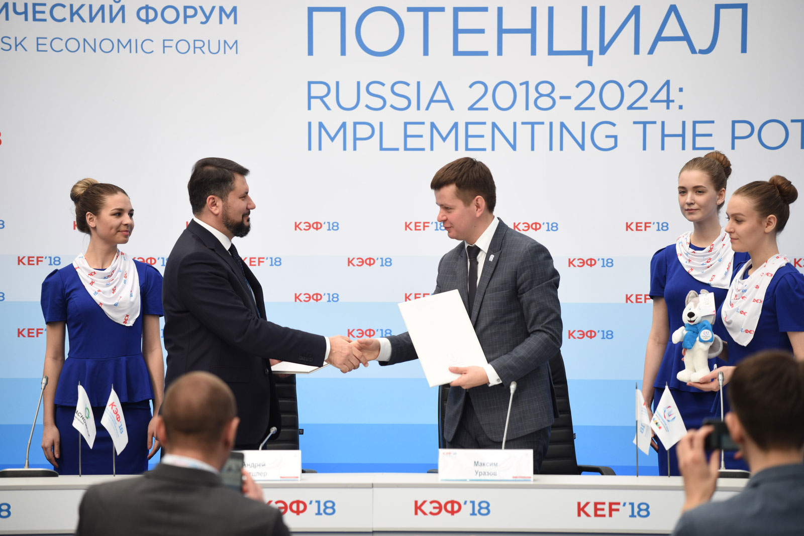 Krasnoyarsk 2019 Director General, Maxim Urazov, (right) and the Krasnoyarsk international airport director, Andrey Metsler, during the agreement signing