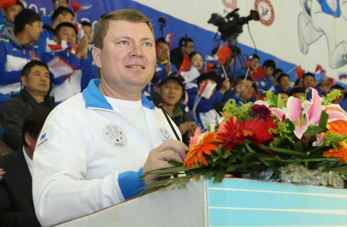 Sergey Yermin, Major of Krasnoyarsk, speaking to the audience during the Universiade Flame ceremony in Harbin