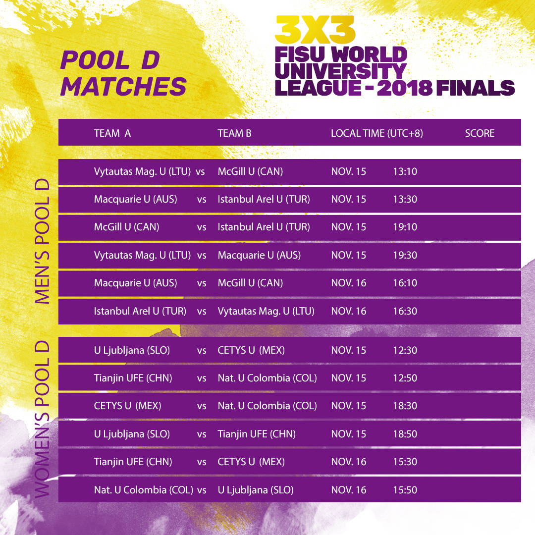 Vytautas Magnus University 3×3 teamThere are also 4 teams each in the men’s and women’s competition that have received wildcard entries. This includes the 2016 men’s champions McGill University of Canada. They go up against Lithuanian heavyweights Vytautus Magnus University on the very first day and that’s certainly one of the matches to watch out for. (Scroll down for a snapshot of the schedule, while the full tournament schedule can be found here.)