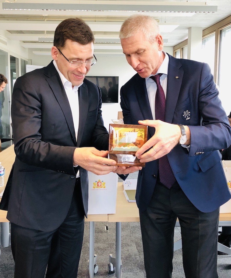 LAUSANNE, 10 April – A delegation from the Russian city of Ekaterinburg led by Evgeny Kuyvashev, Governor of the Sverdlovsk region, visited the FISU offices in Lausanne to throw weight behind their bid to host the Summer Universiade in 2023.
