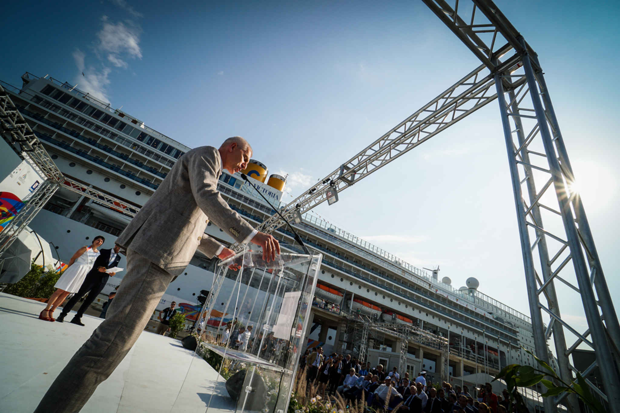 FISU President Oleg Matytsin (second from right) and CUSI President Lorenzo Lentini (far left) helped cut the ribbon to christen the two cruise ships as the most innovative and interesting Universiade athletes’ village to date