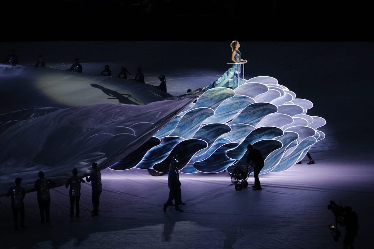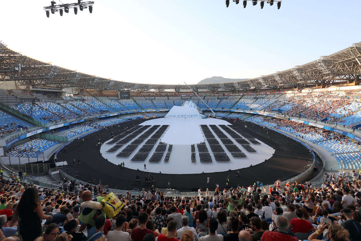 The evening began with the appearance of the mascot Partenope, the mythical siren or mermaid who appeared from the sky and floated gracefully onto the sea. At one end of the stadium was the glistening float representing waves and on the other, a replica of Mount Vesuvius glowing in shades of amber and red – the imagery thus capturing the very essence of Napoli.