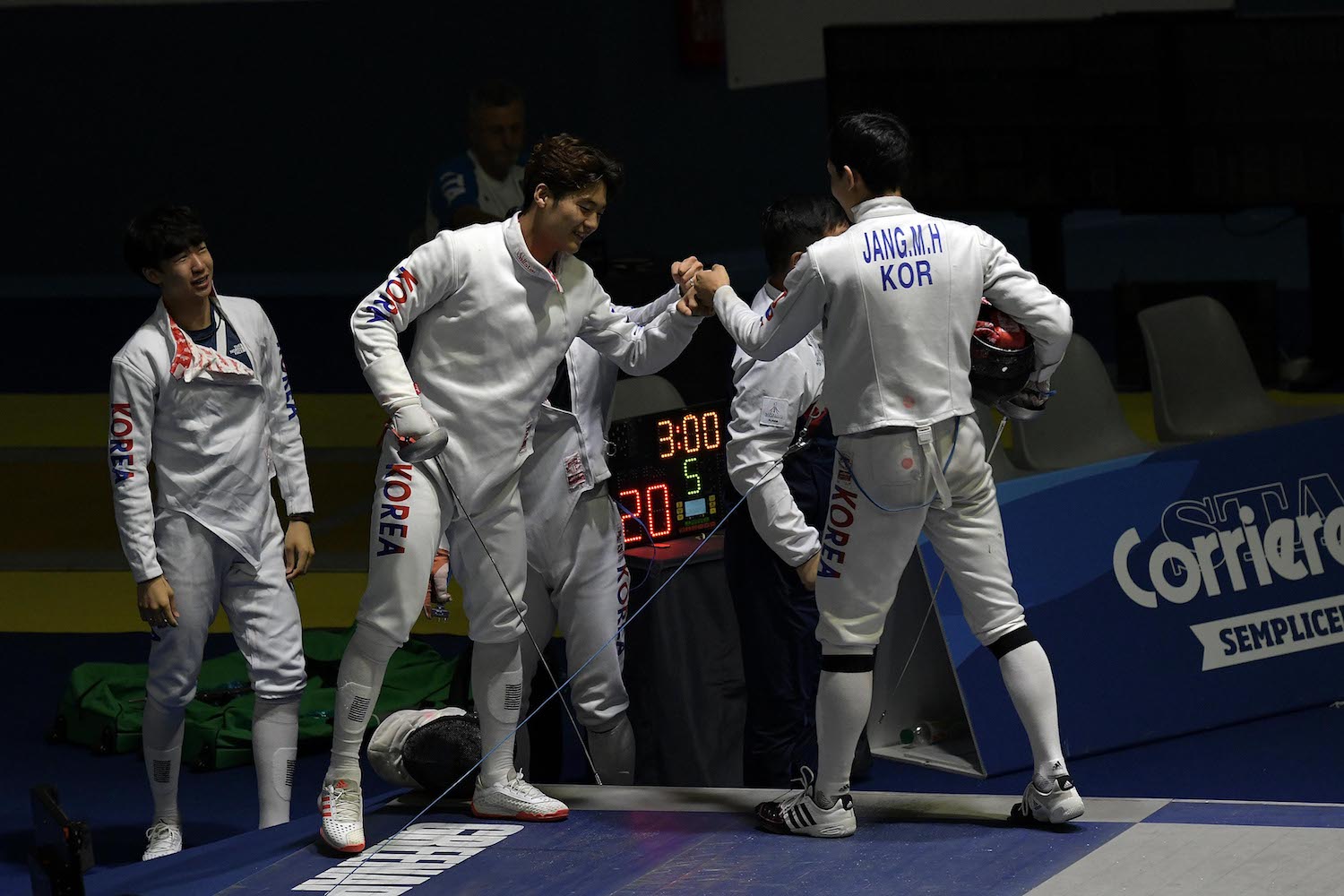 In the men’s epee event, South Korea won gold defeating Russia 45-31 in the final, while Italy took bronze. After a close start, the Koreans took command, with Lee Seunghyun and Jang Minhyeok using explosive speed to dominate contests against Alan Fardzinov and Dmitrii Shvelidze and take them from 9-9 to 20-11.