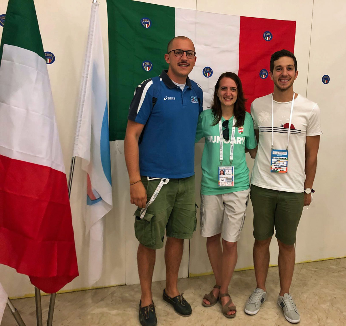 Andrea Ippolito (far left) is joined by article author and fellow 2018 Student Ambassador Julianna Király (centre) and Gabriele Candela, Italy’s next FVLA participant during the Napoli 2019 Summer Universiade
