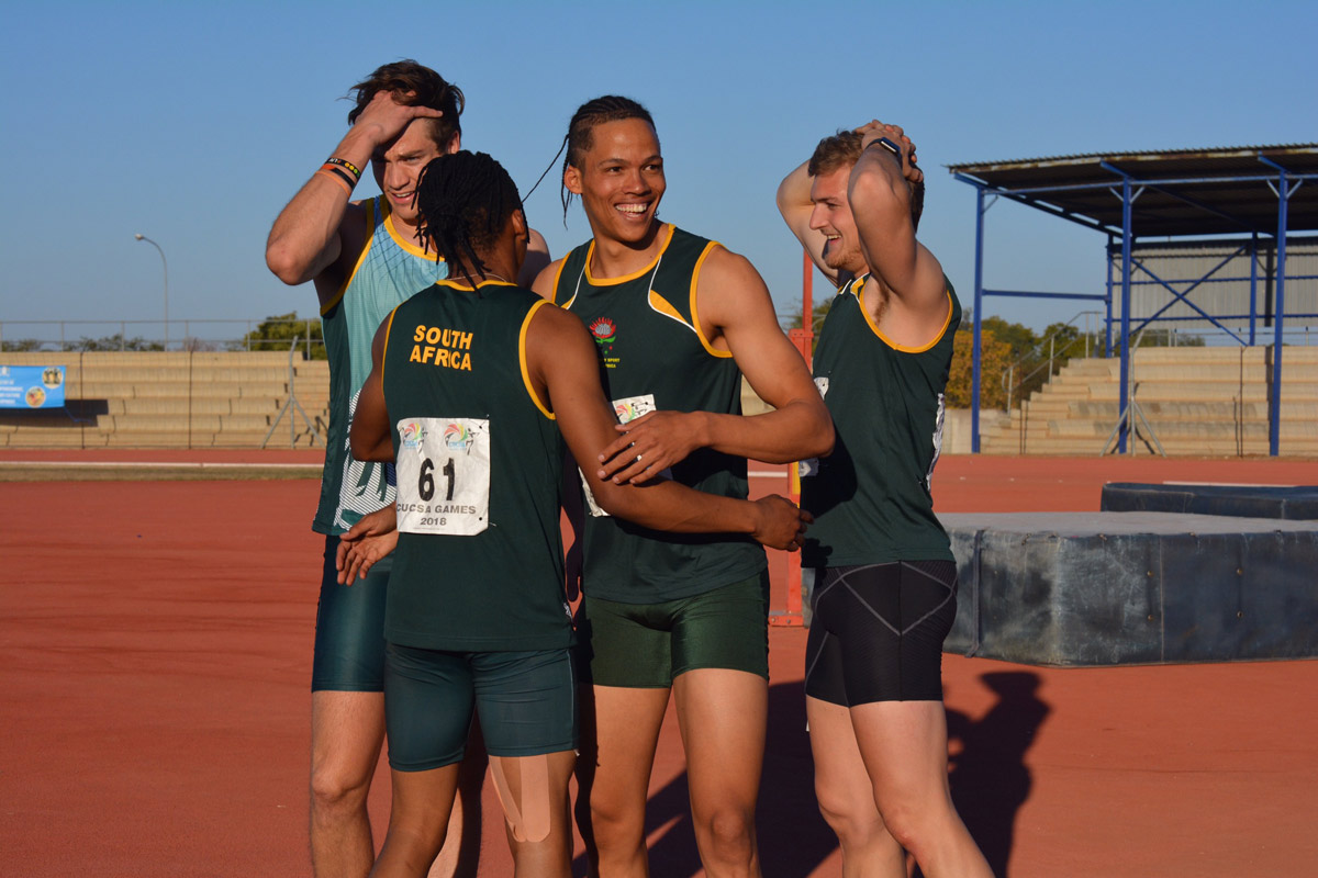 Van Wyk and his 4x100m teammates celebrate victory at the CUCSA Games last year. Following Van Wyk’s performance in the 100m and 200m, he earned the right to represent South Africa at his first Summer Universiade in Napoli