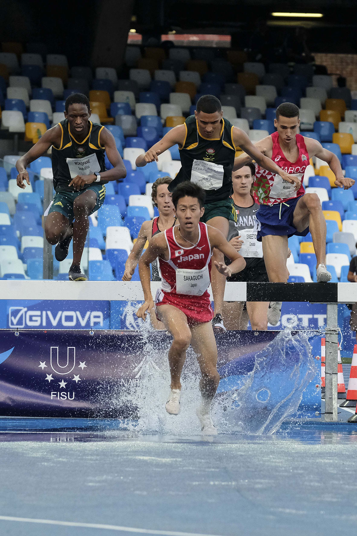 In action at the water pit during the Napoli 2019 Summer Universiade steeplechase finals