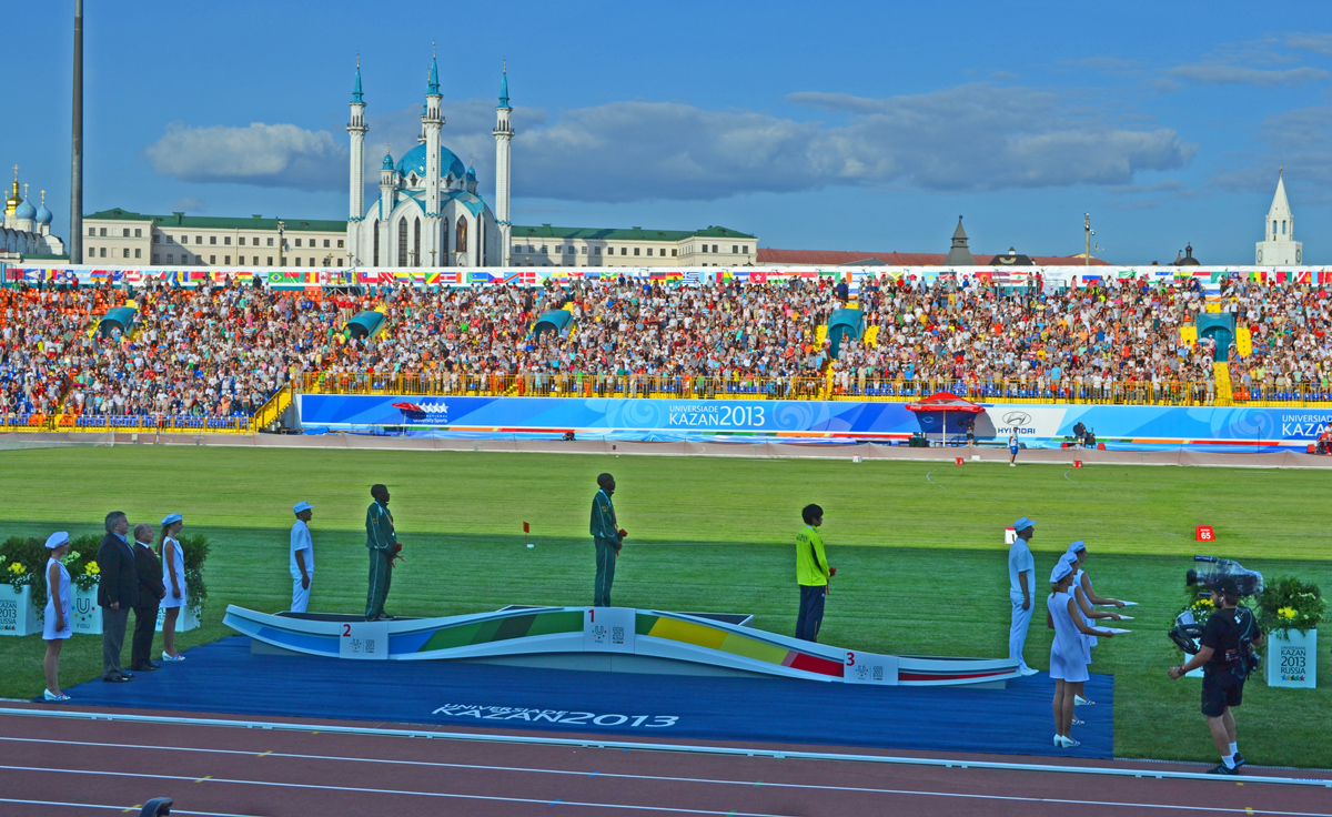 Mokoka on the 10,000m athletics podium during the Kazan 2013 Summer Universiade