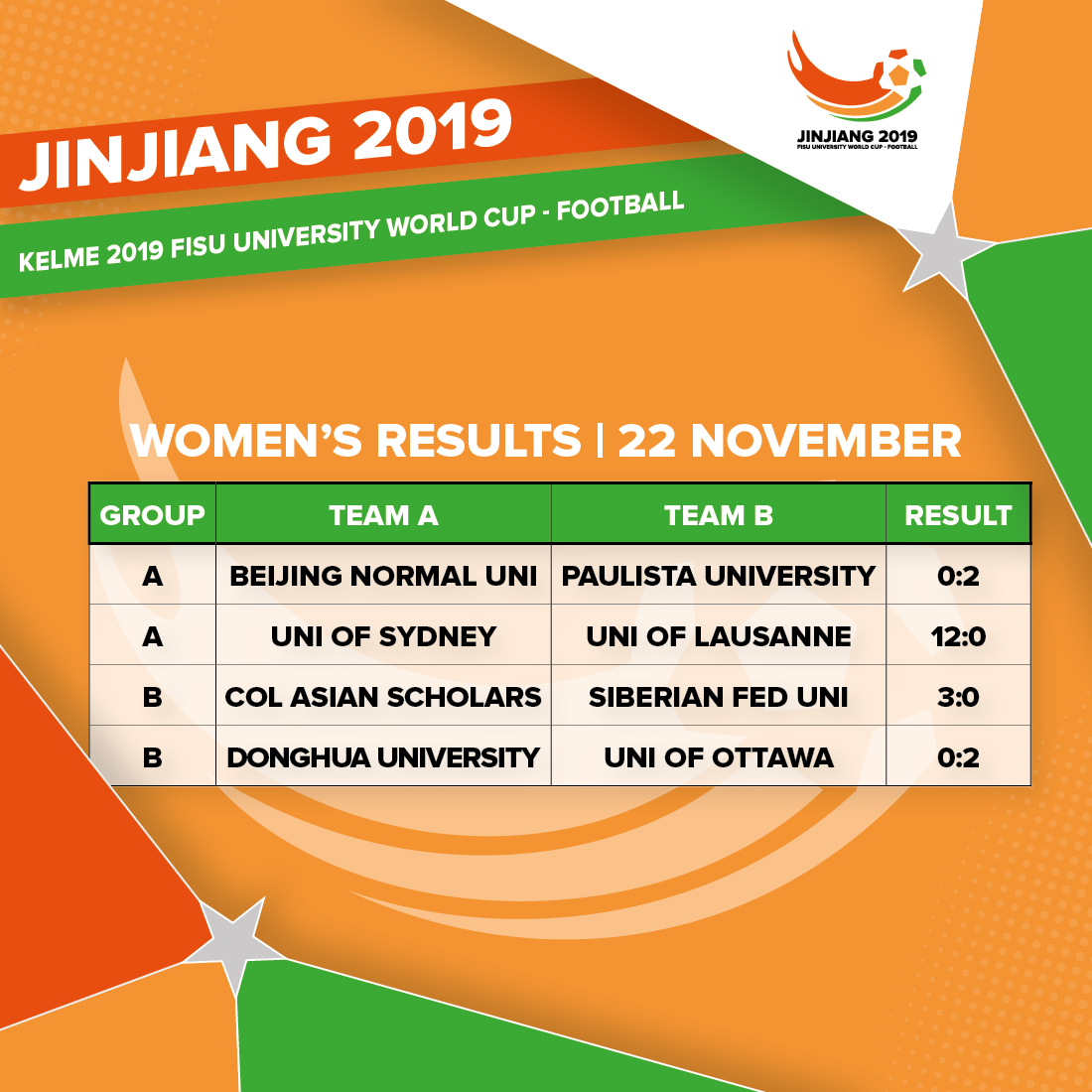 The confidence may be well deserved after tonight’s performance but they will come up against University of Sydney soon, who stamped their authority on the tournament with a 12-0 rout of University of Lausanne. Also registering opening day wins in the women’s tournament were the University of Ottawa (CAN) and College of Asian Scholars (THA).