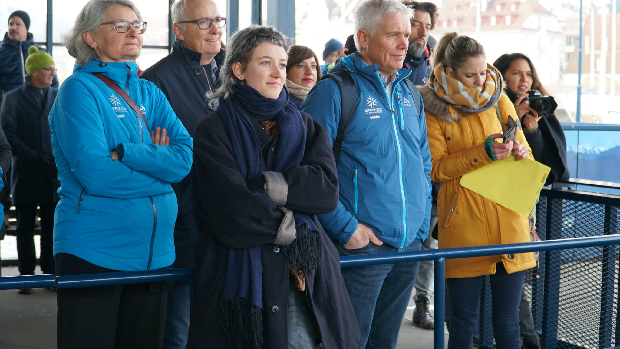 The Lucerne 2021 mascot designer Luisa Zürcher (centre)The mascot arrived by boat, dancing to the tune of a traditional ‘Kugel’ band that accompanied it. It was immediately clear that the personality of this mascot is its strongest characteristic, as it danced, played pranks on gathered spectators and generally lifted the mood drastically on a cold weekday morning.