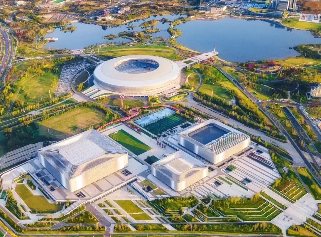 Designed by HKS, its inspiration is from a tea infusion set called Gaiwan that allows people to see the stadium as a bowl, the plaza surrounding it as the saucer, and the gymnasium as the lid that goes on top. This ties to the strong tea house culture that exists in Chengdu. The exterior of the venues is based on Shu Jin, or Sichuan Brocade, which originated in Chengdu, and the surface gives the impression of silk threads that attract and reflect light uniquely throughout the day.