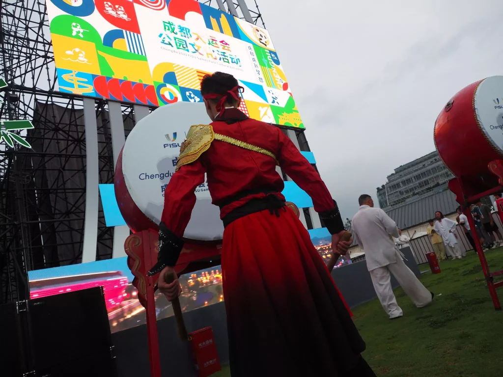 FISU Director General Paulo Ferreira and Zhang Ruiqin, Member of the Party Leadership Group of the Executive Committee of the Chengdu 2021 FISU Games, were invited on stage to exchange gifts and play the traditional drum, thus officially marking the opening of the Cultural Park.