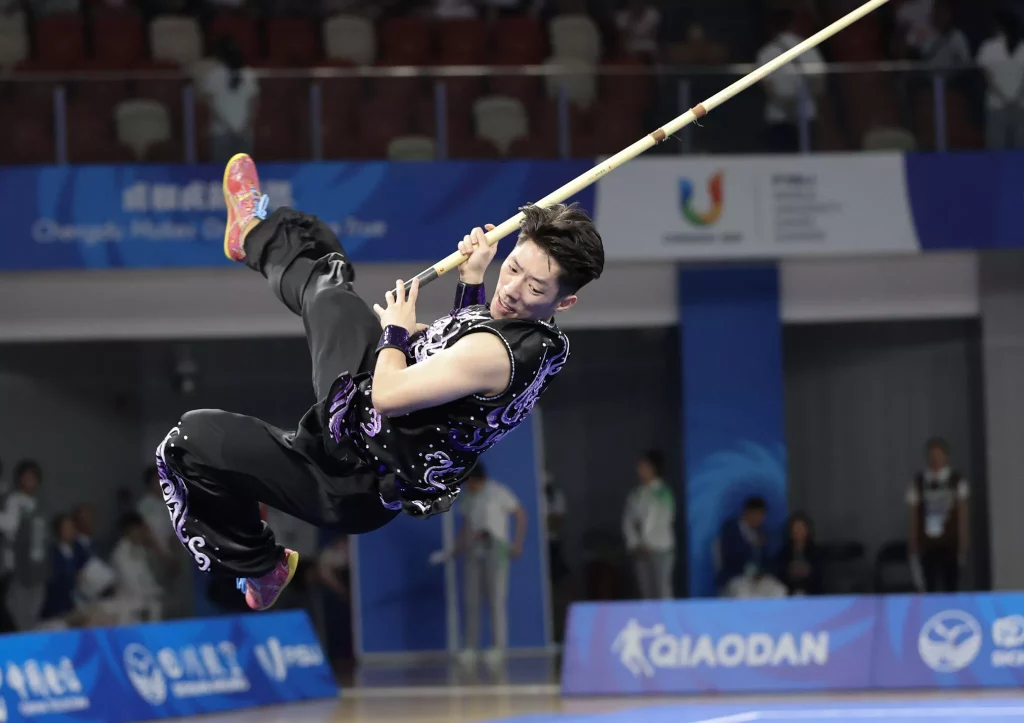 After triumphing in the men’s nanquan a day earlier, Cao Maoyuan, from Chengdu Sports University, earned his second gold of the FISU Games, thanks to 9.753 points in the nangun event.