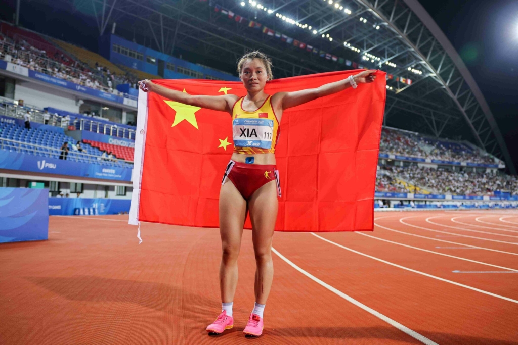 Xia waves to the crowd after winning bronze in the women’s team half-marathon“Actually, I never thought that I could get into Tsinghua University before going to Beijing because it’s the top university in China, and it’s very difficult to get into,” said Xia Yuyu, the Chengdu FISU World University Games women’s 10,000m gold medallist, silver medallist in the women’s 5,000m, and third place finisher in the women’s half-marathon team event.