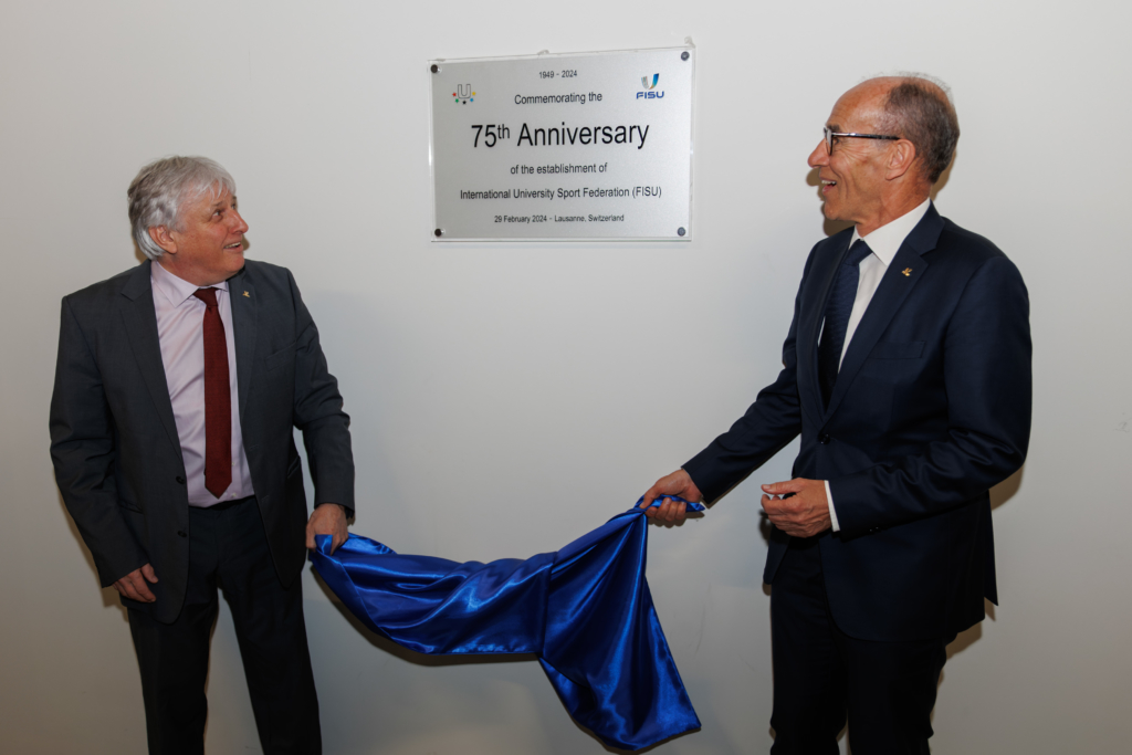 The two days of meetings took place at the Royal Savoy Hotel in Lausanne, Switzerland, at only a stone’s throw from FISU Headquarters. They started off with the unveiling of a plaque in FISU’s Synathlon building, celebrating FISU’s 75th anniversary.