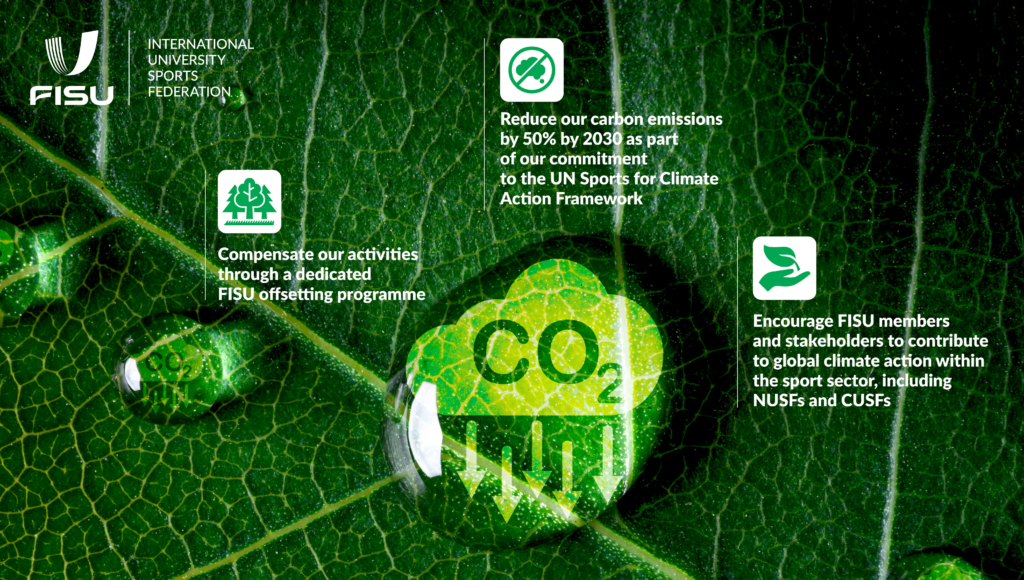 FISU has been a dedicated signatory of the UN Sports for Climate Action Framework since 2022, a framework founded by United Nations Climate Change designed for sports organisations and stakeholders in the sport sector to provide support in achieving global climate change goals. Using this framework, FISU hopes that its members can commit to take action and help reduce global threats posed by climate change.