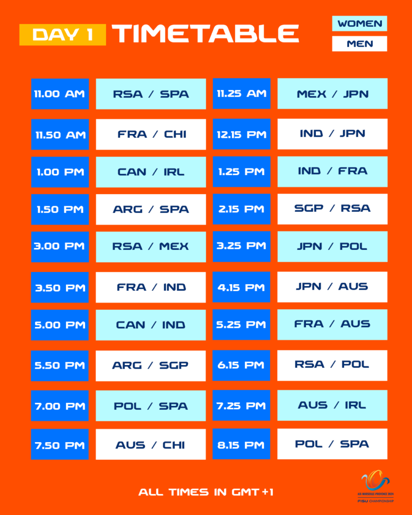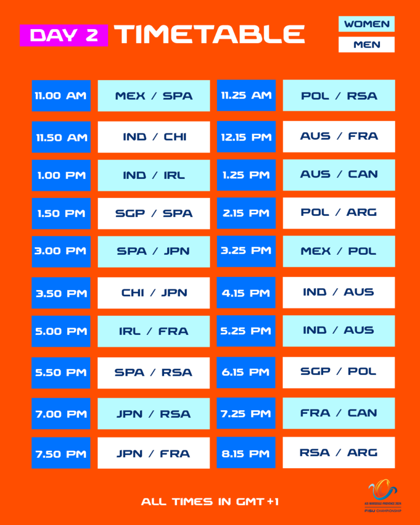There will be 20 teams (10 men and 10 women) from 13 countries competing in Aix-en-Provence. South Africa, India, Japan, Spain, Poland, France and Australia will compete in both the men’s and the women’s games, Chili, Argentina and Singapore only have men’s teams and Canada, Mexico and Ireland only women.